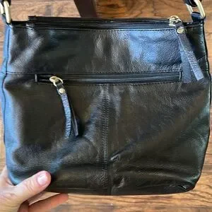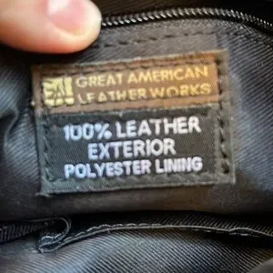 Great American Leather Works 100% leather bag. Adjustable strap, crossbody or can use a shoulder bag. Very nice and quality bag! Magnetic snap and two zipper compartments, and pockets for cell phone. Size is 10x11