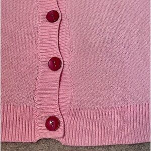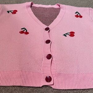 V-neck, button-up front, long sleeves, very thick fabric, cropped, solid pink with cherry pattern.