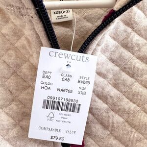 Crewcuts diamond quilted half zip pullover. Size XXS 2-3. Face & Back 100% cotton. Interlay Yarn 100% polyester. Machine wash, tumble dry. MSRP $80. NWT
