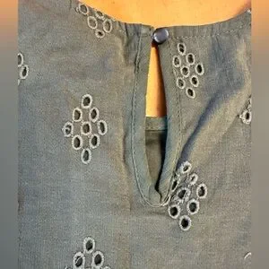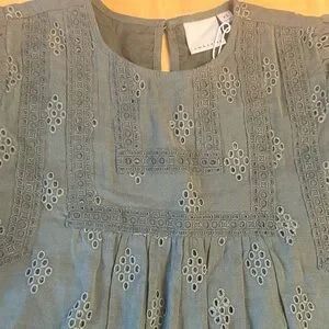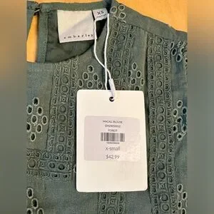 Emberley Macall Eyelet Blouse with Lace Trim, Size XS. New w/tags. 55% viscose/45% cotton. Beautiful blouse with fine details, including pleats on sleeves and keyhole back opening. Bodice is fully lined. 22” length from shoulder to bottom hem. 17.5” pit-to-pit.