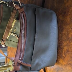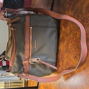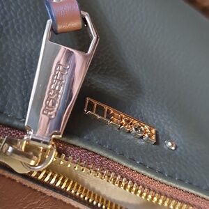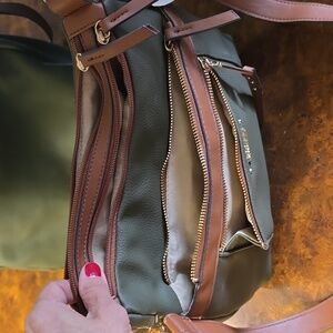 Olive green and brown leather Rosetti purse with gold accents and 6 pockets. Gorgeous bag very spacious and easy to carry day to day! Rosette, olive and brown pebble, leatherbag, shoulder or crossbody