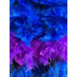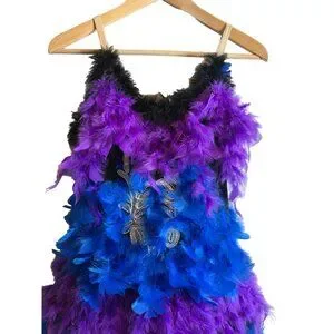 Feather Adjustable Strap Ballerina/ Mardi gras Dress Halloween Costume Blue & Purple. This intricately designed feather dress showcases an array of vibrant blue and purple hues. Its unique construction offers a striking visual appeal, suitable for themed events or performances. It has a built in slip and crinoline that provides a structured shape to the dress. It is handcrafted with attention to detail, it provides a luxurious and bold fashion statement. EUC. Minimal signs of wear.