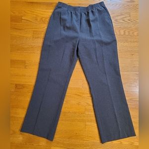 Vintage charcoal grey trousers, size 10 petite, Tradition brand. 18.5" waist. Stretchy waistband. It has no buttons or zippers at the waist. 100% polyester. Excellent preowned condition.