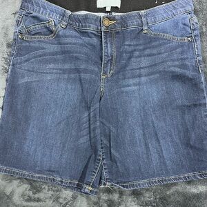 Dark denim shorts wide elastic slimming inside waistband inseam 9” rise 10”