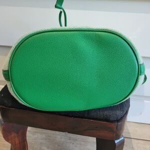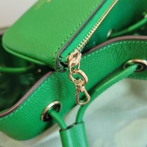 Beautiful green bucket bag. The drawstring component has a flaw. I believe it would be a simple fix with glue or a sewn in tack. Priced low due to this issue. Only used 2 times before the drawstring broke. Clean yet from a pet friendly home.