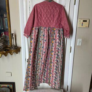 Vintage Women's Housecoat. This has got to be at least 40 years old. Some condition issues inside with wear (see pics) and some loose threads. Belt attached at empire height. Textured buttons and only one pocket. Pit to pit 20, waist - 38. Total length - 54. Tag was cut, maybe cotton blend outside, poly inside. Just a fab find.