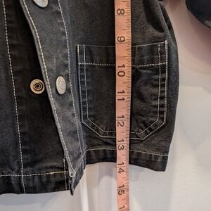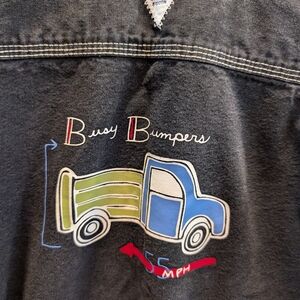 adorable little oversized black denim jacket with multiple patch pockets. big dumptruck on the back of jacket that's says busy bumpers