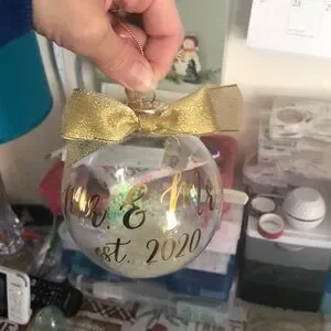 This ornament is glass that says Mr. & Mrs. Est 2020 in gold cursive. Has a gold bow at the top and a gold sting. The metal is silver. It’s a clear ball. The sprinkles are white with a shimmer of colors. It’s in good condition. We have kids and don’t want breakable ornaments near them. Will be wrapped with love.