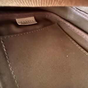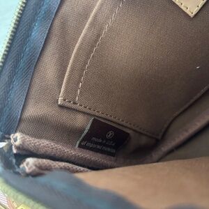 Bag is in used but favorable condition. Small white marking on the back side towards the lower right. Some markings and small stains on the interior. Discoloration on tan logo on the front of the bag. Strap and dust bag included. Does NOT come with round attachable coin purse. Code# SD2250.