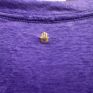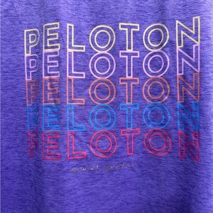 Spiritual Gangster X Peleton women’s muscle tank. Lightweight fabric. Purple with PELOTON printed down front in multiple colors. Spiritual Gangster script on front in gold and tiny gold logo on upper back.
