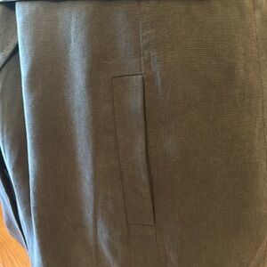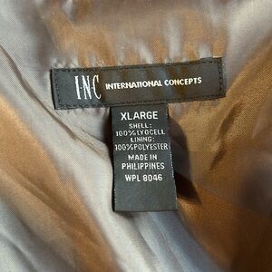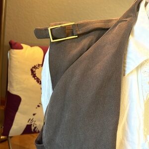 Beautiful and flattering vest. Gold tone buckles at shoulders and buckle at waist. Another plus is the belt is attached so it can’t be lost! Pit to pit is approx 25” and length is 35” from shoulder. Shell is lyocell and lining is polyester. Nice vest