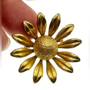 Vintage Small Gold Tone Floral Flower Daisy Brooch Pin Textured Center. 1 1/4” Dainty Vintage piece. Minor signs of wear consistent with age. The pin rod is slightly bent but still works and is secure. In beautiful vintage condition.