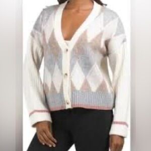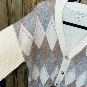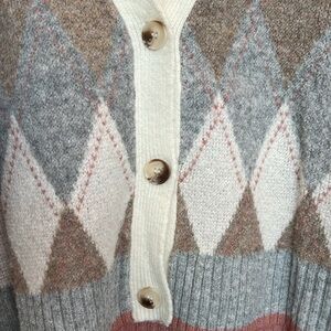 V neck cardigan with 3 button closure. Argyle plaid design. Cuffed wrist. Solid ribbed back and sleeves. back. Boxy fit. Size medium. Bust measures approximately 24 inches and length is approximately 22 inches.