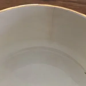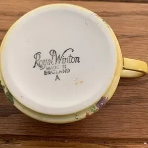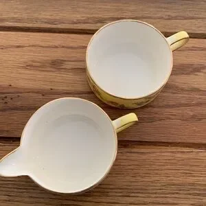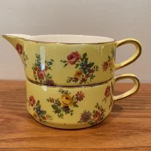 Royal Wilton made in England, stackable sugar and creamer cups. 2pc set is in good condition. There is a hair line surface crack inside creamer but is not a crack all the way through (see picture) a very minor imperfection, especially for how old this set may be. Yellow with flower pattern and a gold trim.