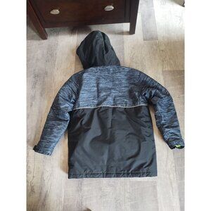 Polyester shell, fill and lining, long sleeve with Velcro adjustment, hooded, two front zipper pockets, removable fleece inner liner, black and gray, heavyweight, good condition and quality