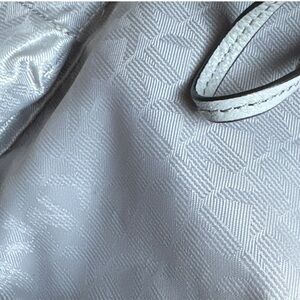 Lock & key charms. MK interior, large middle pocket zip closure. Two outside pockets have magnetic button closures. Several small pockets