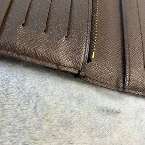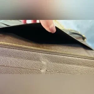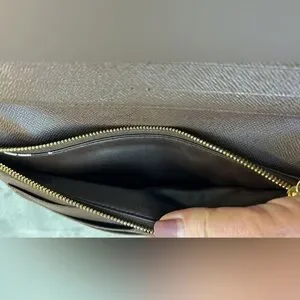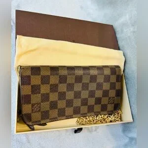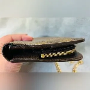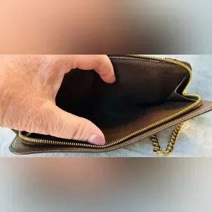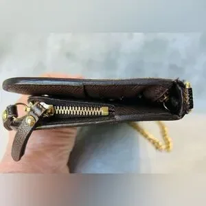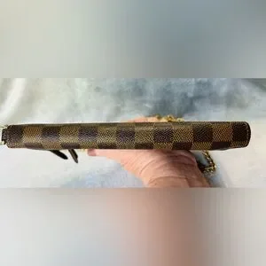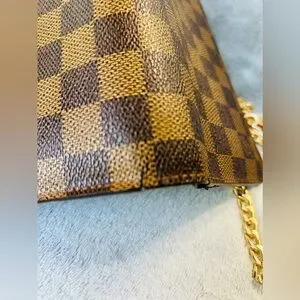 Awesome LV Damier crossbody wallet bag. Great for casual and black tie events and even a personal collection. You don’t see many of these styles. I can see why they are amazing. This is in very good condition, there is some very minor cracking on the corners. There has been one stitch placed where it has torn a few stitches just to hold back more damage. A shoe cobbler can easily repair. All zippers good, inside of pockets are not damaged. There are some initials of “KK” which can be professionally removed also. I added an aftermarket chain for ease of wear and great style! Total inclusion of dust bag and box!! The date code is right wear the tear is probably from pulling it to see the code, I won’t pull on it very hard therefore I can’t get a clear image of it, however it is there. These are authentic bags, wallets etc. I only source from people I trust. This is perfect for gift giving just as it is but even better if the minor repairs are done!