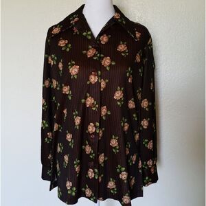 70s/80s rose print blouse with faint pinstripe background and dagger collar in good vintage condition with some fading on the sleeves and a tiny pull on the collar.