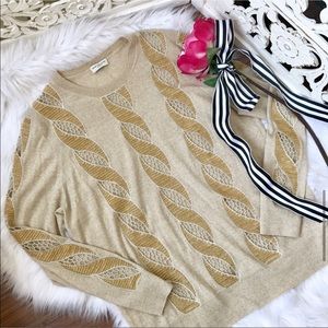 This embellished sweater by Dries Van Noten is the ultimate addition to your designer wardrobe! Featuring gold beaded embellishments against an oatmeal colored crewneck sweater. Embellished areas have a fishnet cutout detail as well. Four small holes, as pictured, but otherwise in excellent condition! No missing beads.