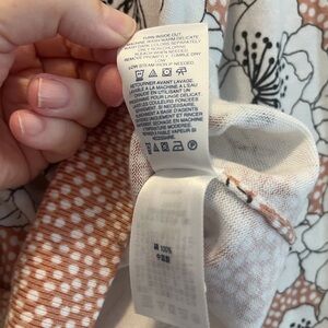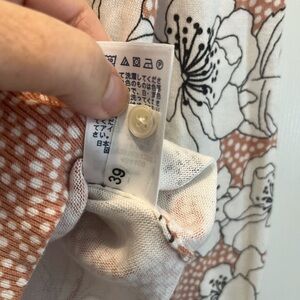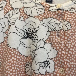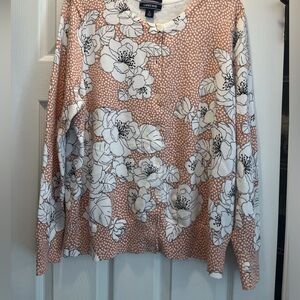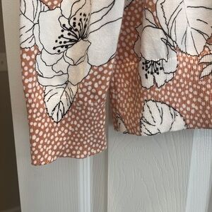 Size L cardigan, worn 1-2x, floral print with dots, color is between a fawn- dusty rose, pinkish brown color, with black and white floral print. No flaws, imperfections, smoke and pet free home. Same or next day shipping. Great for fall, with white or black pants, skirt.