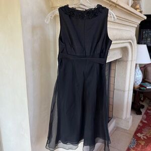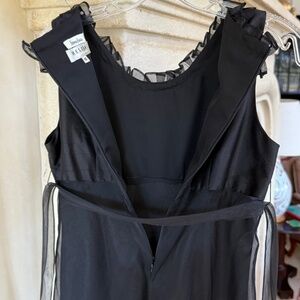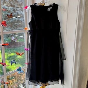 Worn only once nearly 15 years ago! Classic party or holiday dress. Ruffle detail around the neck, waist tie, and zipper back. Close to perfect condition.