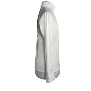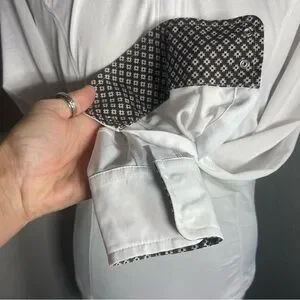 Decorative contrasting fabric at collar and cuffs.
