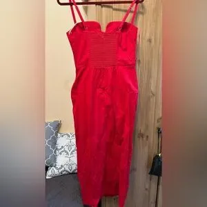 Features back smocking, adjustable straps, a sweetheart neckline, and a side slit. It includes a center back zipper, is midi length, has a smocked back bodice, is strapless bra-friendly, and is unlined.