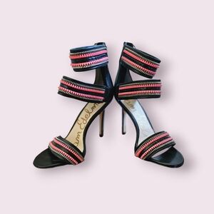 SAM EDELMAN BLACK/SALMON DOUBLE BAND ANKLE HEELS.