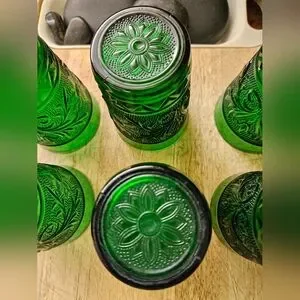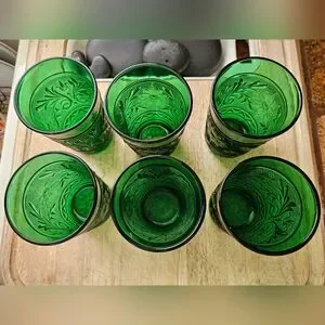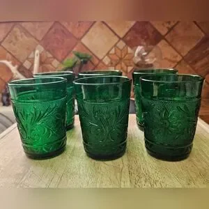Pre-Onwed Set of 6 Vintage from the 1950s Anchor Hocking Emerald Green Glasses 4" high. Sandwich pattern. No chips or cracks.