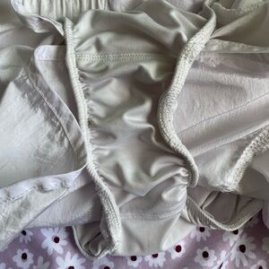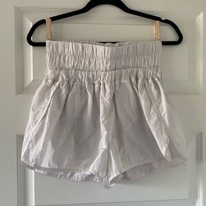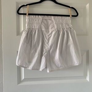 Breezy, warm-up style running shorts, featuring a smocked waistband with a high-rise silhouette and split hem. Back key pocket. Fantastic condition, no holes or stains