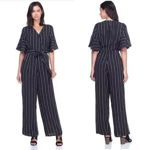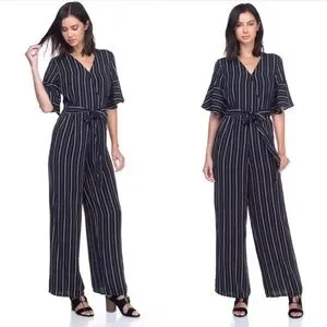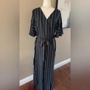 Black striped jumpsuit features short sleeves, surplice front with snap closure, back zipper.
