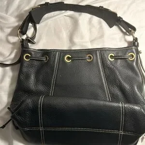 Black pebbled leather drawstring bag. Tons of room for everything you need to get through the day. Front tassels with small interior pocket.