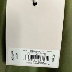 NWT women’s blazer from Kohl’s. Color is a safe green, closest match it the pic with the close up of the LC tag.