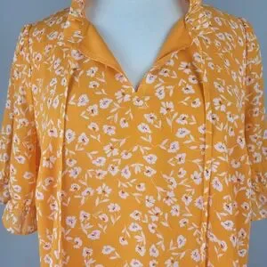 J Crew floral ruffle sleeve, tie neck top. Tangerine color wuth white flowers. Like new condition. Size XL