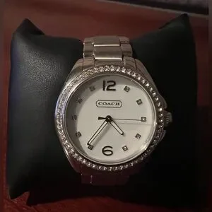 Coach ladies stainless steel bracelet watch. Mother of pearl round face with crystals around the bezel and at the hour markers. Water resistant. 37 mm. Needs battery. Very good condition.