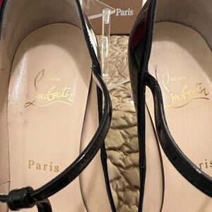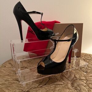 Christian Louboutin Burlina patent peep toe pump in black patent leather. Only worn a couple times. Light wear on soles otherwise like new. Comes with dust bag and original box. This style runs slightly small.