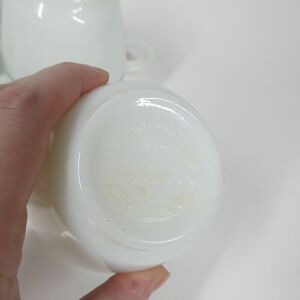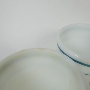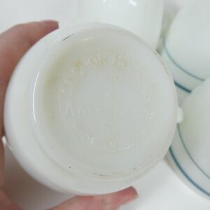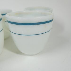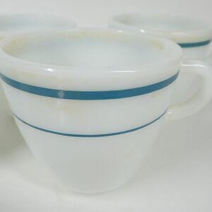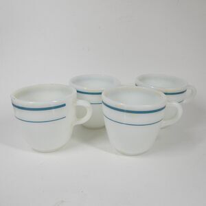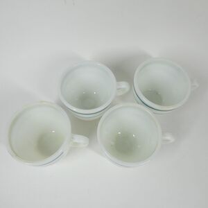 Set of 4 vintage Anchor Hocking Anchorware coffee mugs. Made in U.S.A. Style 910. White milk glass with a teal blue stripe pattern on the exterior.