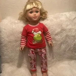 My life, 18 inch blonde lifelike doll in excellent condition , with grinch shirt, and leggings. Perfect Christmas gift for that little girl in your life