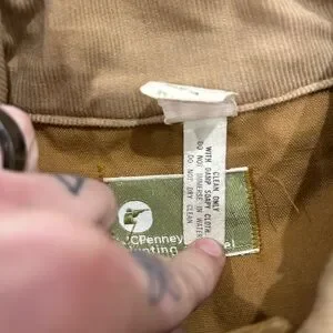 Vintage 70s canvas coat in overall great condition. Corduroy collar. 3 pockets on the front. It looks like the two lower ones have elastic holders for bullets. The size has rubbed off the tag, I’m calling it a medium or large, see measurements.