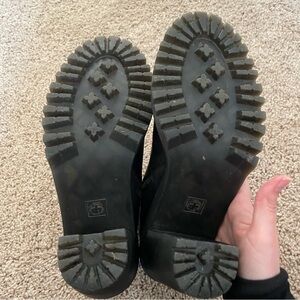 Lug soles, chunky heel, side zippers, ankle height, black leather, rounded toe, edgy fun every day boots