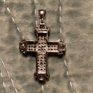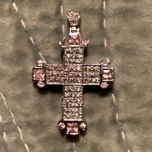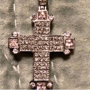 Gorgeous Statement Cross purchased from a jewelry boutique on the Island of Santorini, Greece. Setting is Sterling Silver Rhodium with pale pink stones in cushion cut at all 4 points, and middle of the Cross is blended with pink and white round stones. They may be sapphires, or Crystal quartz and sparkle beautifully.