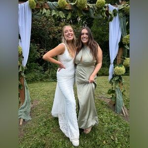 Show Me Your Mumu bridesmaid dress, true to size! I wore once for my friend’s wedding last month and have had it dry cleaned since. I did use hemming tape to cuff the bottom since it was very long, so I’ve included a photo where the glue shows through (however if you’re planning on having it tailored to be shortened already, this shouldn’t be a problem!). All other hemming tape is only on the inside of the dress.