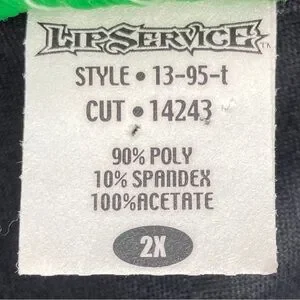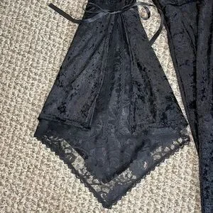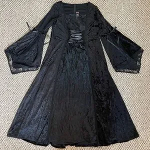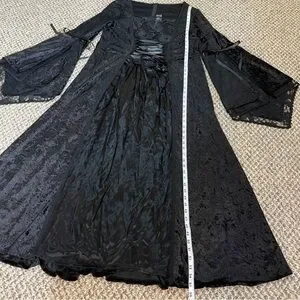 Preowned in excellent condition. 90% Polyester and 10% Spandex velvet. 100% Acetate skirt and lining behind lace front. Black zipper closure in the back. The velvet drapes over the skirt around the sides to the front. Very long split angel sleeves with ribbons above split and lace lining. It has some stretch and good weight to it. Made in USA.