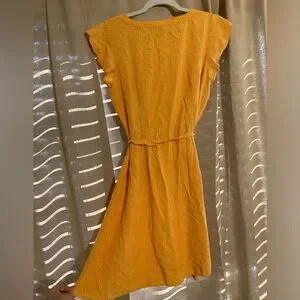 Turn heads in this fun and flirty yellow polka dot dress! Sleeves have a flutter detail and a matching belt to cinch and accentuate your waist!