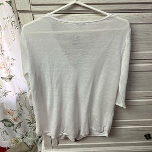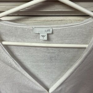 JJill white button cardigan, lightweight, short sleeve, Sz S, length 29”, 2.5” side slits, pit to pit 20”, sleeve length 9”, rounded v neck, linen/cotton/modal, minimal wear