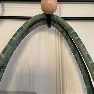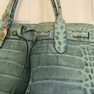 Rare Dooney & Bourke bag in teal embossed patterned leather. Some scuffing, fading, browning - as shown in photos, particularly to handles and one spot on side - but no major tears, rips, or loss of integrity to the purse. Gold toned hardware. Magnetic closure. Back zipper pocket. Interior zip pocket. Interior pocket originally meant for a palm pilot & stylus! Amazing bag in overall good condition. Smoke free, pet free home with original owner.