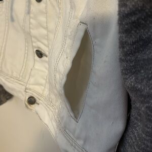 Nice Free People Denim White Button up Jacket. Distressed style look. 100% Cotton. There is one small stain on the front please see the last picture. Thanks for looking any questions or offers don’t hesitate. Length 19”. Pit to pit 17” sleeves from shoulder to cuff 24.5”