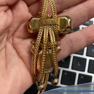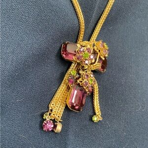 Floral motif, tassels with rhinestones at the ends, even a small green rhinestone on the clasp