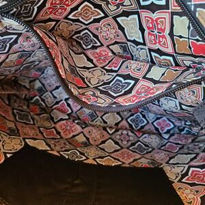 Front pocket with magnetic buckle and a slip pocket behind it as well as end pockets. The interior is beautifully lined in a contrast pattern