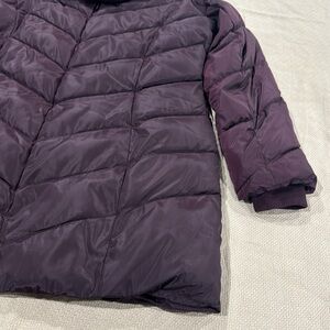 Very nice and warm women’s puffer jacket size XL in great condition. The color changes a little bit with the light. The hood is detachable.